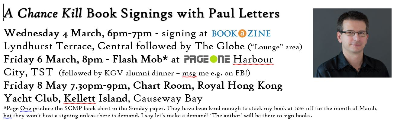 If you like this novel and could help spread the word, it would help me to justify to my wife why I should spare time from my relatively better paid careers (I’m a part-time teacher and journalist) to produce more painstakingly ( – painfully, she would say – ) researched novels. Please tweet, chat and share – and help get A Chance Kill in front of people who will enjoy it. Many thanks, Paul.