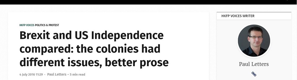 US Independence Day & Brexit THIS ARTICLE APPEARED ONLINE IN THE HONG KONG FREE PRESS ON 4 JULY, 2016. CLICK FOR THE FULL ARTICLE. Share this: Click to share on X (Opens in new window) X Click to share on Facebook (Opens in new window) Facebook Like Loading...